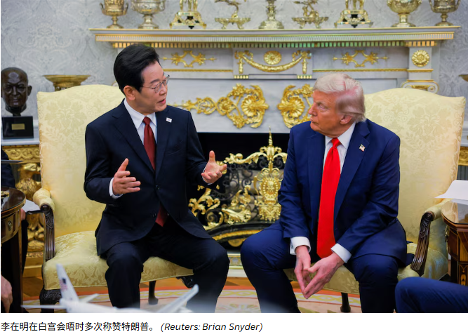 李在明则在会谈中多次称赞特朗普的领导力、和平努力以及椭圆形办公室的新布置。会晤结束后,特朗普称赞李在明是“韩国非常好的代表”,并表示相信双方已经在贸易方面达成共识。