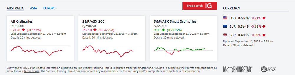 周四午盘前,澳大利亚股市继续下跌,金融和医疗股拖累指数,但黄金矿业股持续上涨。澳大利亚标普/澳交所 200 指数在澳大利亚东部标准时间 12:36 报8799.1 点,下跌 31.3 点,或 0.4%,11 个行业中有 6 个下跌。澳元在澳大利亚东部标准时间 12:44 兑换到 66.10 美分。