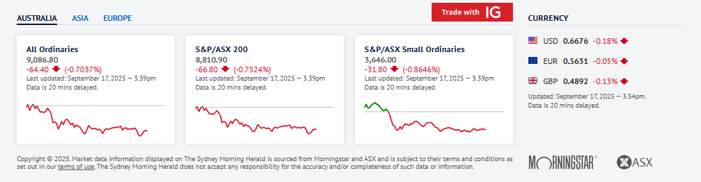 在午盘之后,澳大利亚股市进一步扩大跌幅,矿业与金融股下挫,此前受联邦储备局利率决定临近影响,华尔街从历史高位回落。截至澳东部标准时间下午 1:29,S&P/ASX 200 指数下跌 63.8 点,或 0.7%,报 8813.90 点,11 个行业中有 8 个走低。周二澳股曾上涨 0.3%。澳元在午后不久兑美元报 66.77 美分。