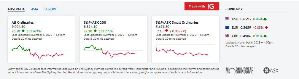 澳大利亚股市收窄了早盘部分涨幅,但在下午早些交易时段仍小幅上涨,跟随华尔街走强——在公司季报表现稳健和美国经济表现韧性提振投资者情绪后,买盘重新入场。截至澳东夏令时下午 1:39,S&P/ASX 200 指数上涨 16.5 点,或 0.2%,报 8818.5 点,矿业股在隔夜黄金价格上涨后领涨。科技股则在周三下跌后表现分化,周三的跌势曾使 ASX 在前一交易日下跌 0.1%。澳元在澳东夏令时下午 1:37 报 0.6512 美元。NAB 股价暴跌 3.7%,此前该国最大企业贷款行表示,截至 9 月的财政年度现金利润下降 0.2%,因其商业银行计提更多坏账费用且开支上升。