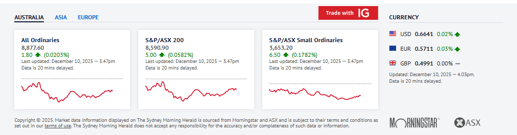 周三金矿股支撑澳大利亚股市,但难以完全抵消科技等对利率敏感板块的跌幅,投资者消化了澳洲储备银行基调转向明年可能加息的变化。截至澳东夏令时间下午 1:42,S&P/ASX 200 在小幅涨跌间波动,下挫 5.4 点至8580.50 点,11 个行业板块中有 9 个收跌。此前一交易日本地股市在澳储行维持利率不变并暗示董事会已开始考虑 2026 年加息后,下跌了 0.5%。截至澳东夏令时间下午 1:34,澳元兑美元报 0.6634 美元。