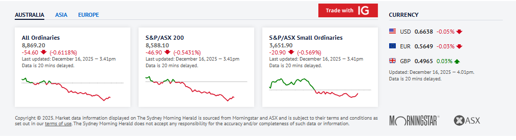 澳大利亚股市开盘大涨,但到午间转为下跌,科技股暴跌抵消了该国银行股的上涨。截至澳大利亚东部夏令时间下午 1 点 22 分,S&P/ASX 200 指数下跌 25.2 点,或 0.3%,报 8609.8 点,11 个行业板块中仅有三个上涨。前一交易日,华尔街在混合走势中徘徊,市场在等待可能决定利率走向——从而影响全球最大经济体股价——的经济报告。