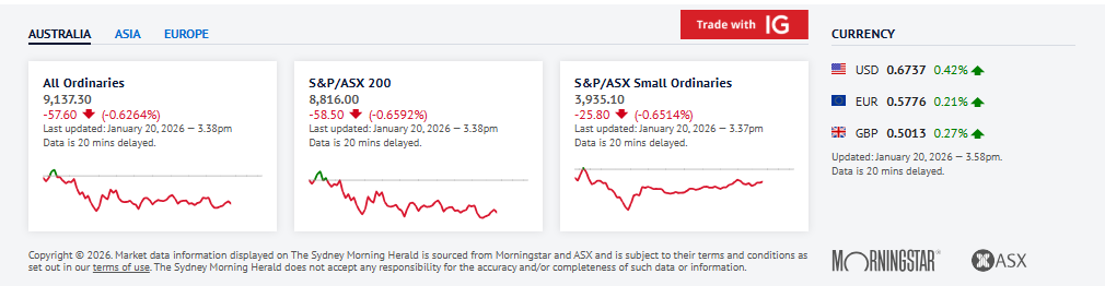 在美国总统唐纳德·特朗普推动接管格陵兰引发美欧贸易紧张之际,欧洲股市大幅下跌,随后矿业和银行股拖累澳大利亚股市走低。截至下午早些时候,标普/澳交所 200 指数下跌 49.8 点,跌幅 0.6%,报 8824.70 点;更广泛的普通股指数下跌 55.2 点,或 0.6%,报 9139.7 点。市场 11 个板块中有 5 个走弱,房地产、矿业、银行和能源公司均录得下跌。