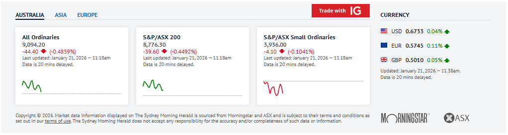 由于在美国总统唐纳德·特朗普威胁对八个欧洲国家实施新关税、并在试图对格陵兰施加美国控制的努力中紧张局势升级后,华尔街在其自那以来的首个交易日大幅下挫,澳大利亚股市开盘走低。标普/澳交所 200 指数早盘下跌 34.4 点,或 0.4%,11 个行业板块中有 7 个下跌。