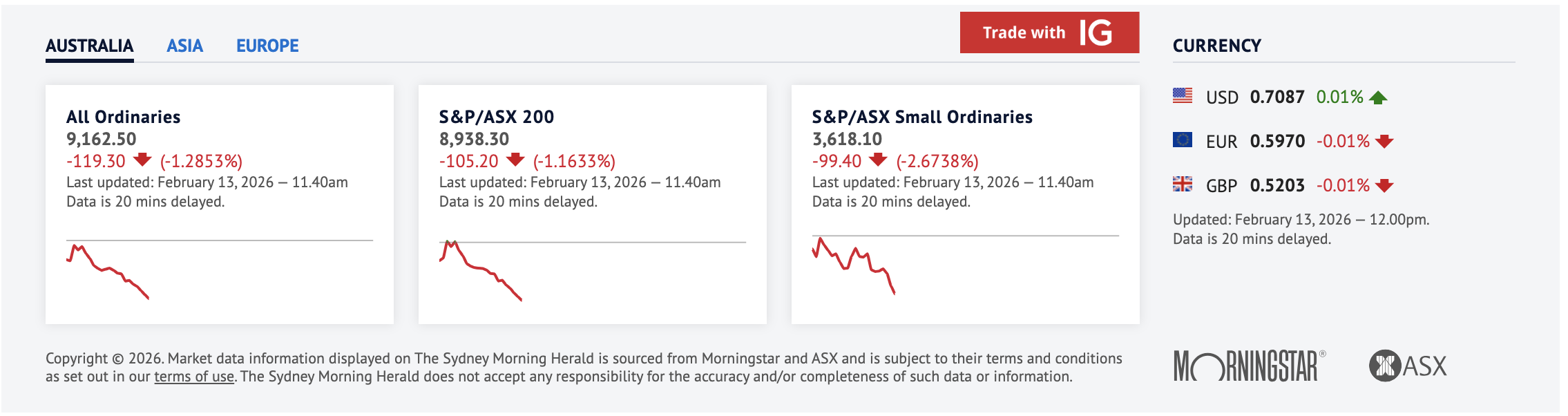 在美国股市大幅下挫后,澳大利亚股市开盘走低,市场惩罚那些被视为可能在人工智能技术中处于劣势的公司。S&P/ASX 200 指数开盘下跌 73.1 点,或 0.8%,11 个行业板块中有 8 个下跌。在人工智能相关担忧再次冲击华尔街后,科技股成为本地指数的最大拖累。